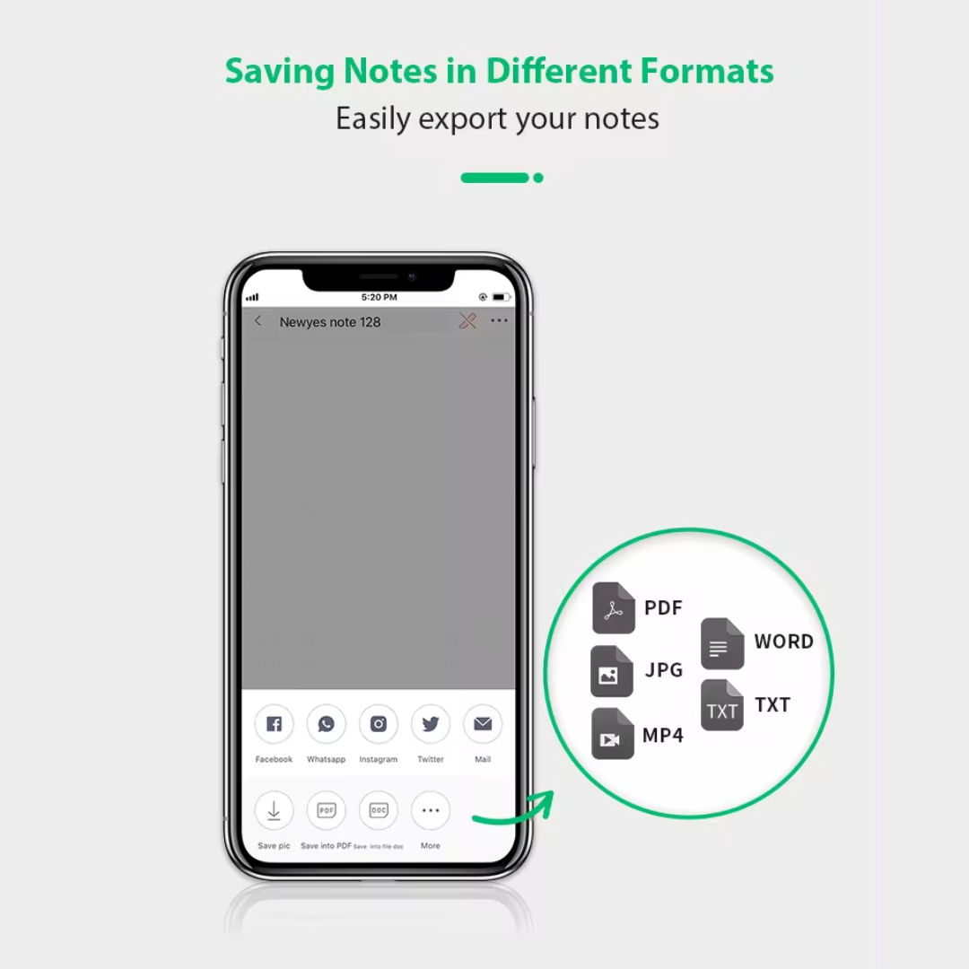 - Multiple file formats: Easily export your notes to .pdf, .jpg, .mp4, .docx and .txt.